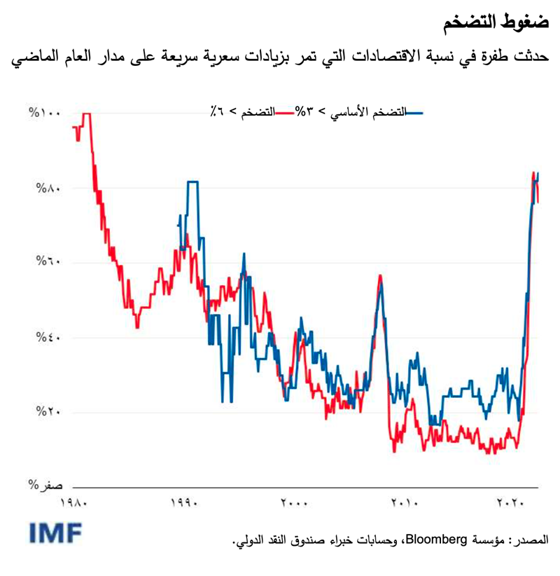 بعد عدة سنوات من التضخم المنخفض، كانت طفرة التضخم أثناء التعافي من الجائحة بمثابة مفاجأة. وتضمن العوامل الأساسية الدافعة للتضخم اضطرابات سلاسل الإمداد، وارتفاع أسعار الطاقة عقب الغزو الروسي لأوكرانيا، والتحفيز النقدي والمالي الهائل الذي استحث الإنفاق على المساكن والسلع المعمرة. وتجاوز التضخم 6% في أكثر من أربعة أخماس اقتصادات العالم، بينما أدت زيادات الأسعار واسعة النطاق إلى رفع التوقعات بشأن زيادات أخرى إلى مستويات مرتفعة قياسا على عدة عقود سابقة.