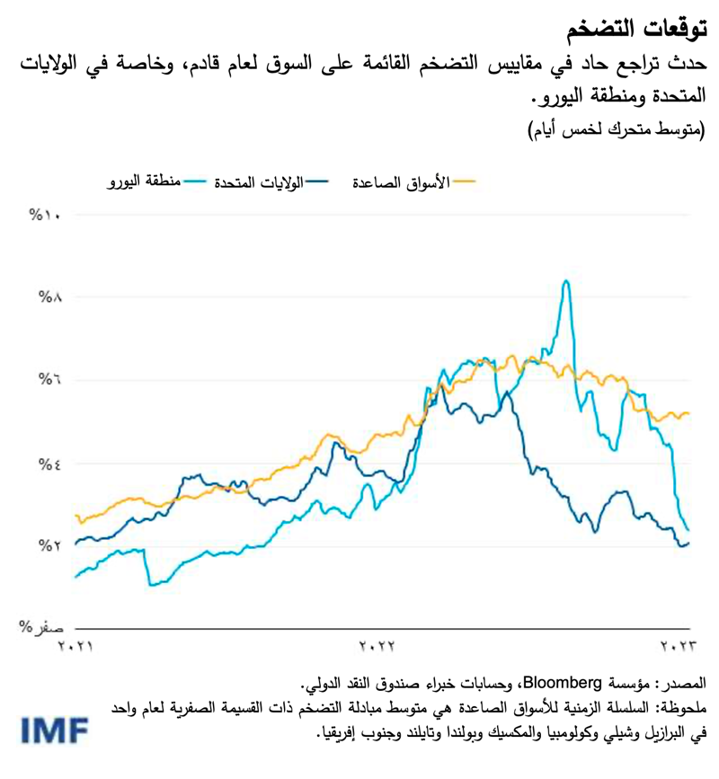 وفي الولايات المتحدة ومنطقة اليورو، عادت مقاييس التضخم القائمة على السوق لعام قادم إلى مستوى قريب من هدف البنوك المركزية البالغ 2% بعد أن سجلت 6% في الربيع الماضي. وشهدت المقاييس انخفاضات مماثلة بالنسبة لعدة اقتصادات متقدمة أخرى. وفي الاقتصادات الصاعدة، تراجعت أيضا هذه المقاييس القائمة على السوق لعام قادم، وإن كان بوتيرة أبطأ.