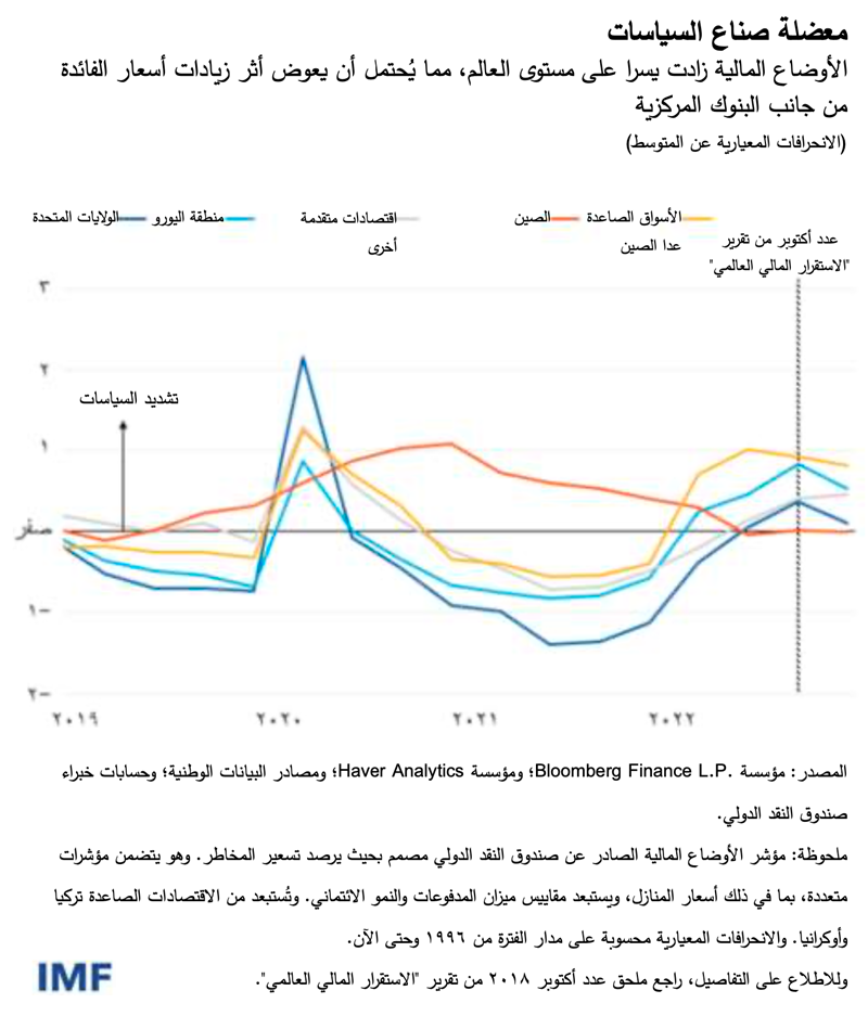 وقد أدى تنامي التوقعات بانخفاض أسعار الفائدة وتباطؤ الاقتصاد على نحو سطحي فحسب إلى الدفع في اتجاه تيسير كبير للأوضاع المالية في الشهور الأخيرة – رغم استمرار رفع البنوك المركزية لأسعار الفائدة. وعكست الأسواق هذا المشهد الحميد نسبيا، فشهدت أسواق البورصة صعودا سعريا، وضاقت كثيرا فروق العائد على السندات مقارنةً بالسندات القياسية.