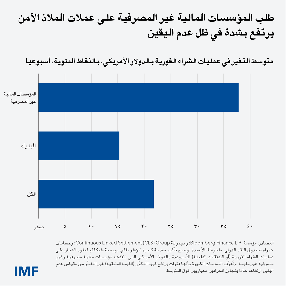 وعلى سبيل المثال، عادة ما تزيد عمليات شراء المقيمين غير الأمريكيين بالدولار بمقدار 24 نقطة مئوية في أعقاب ارتفاع حاد في حالة عدم اليقين المالي - والمتغير البديل هو مقياس للتقلبات المتوقعة في الأسهم الأمريكية - مثل الارتفاع الذي حدث أثناء بداية الجائحة في مارس/آذار 2020. ويوضح التحليل الذي أجريناه لمجموعة فريدة من البيانات عن المعاملات على مستوى العملات الرئيسية أن هذه الزيادة الكبيرة في الطلب على الأصول الآمنة قوية للغاية بين المؤسسات المالية غير المصرفية. وعلى الرغم من أن نشاطها يدعم السيولة في الأوقات العادية، فقد يزيد هشاشة الأسواق أثناء فترات الضغوط.