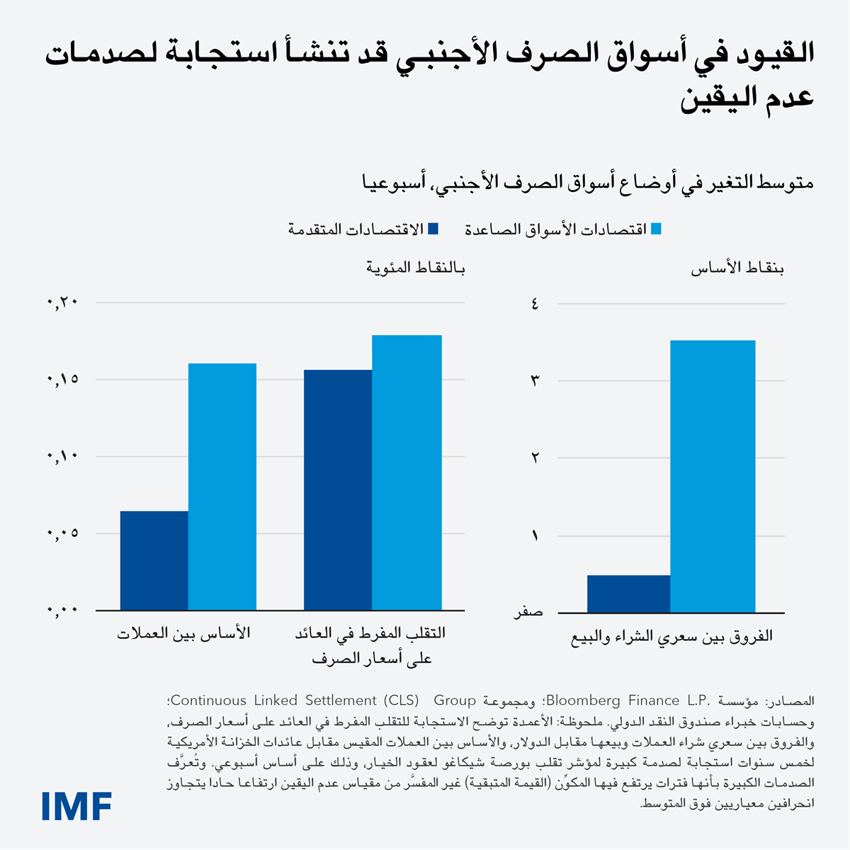 والدور المحوري لهذه السوق في النظام النقدي والمالي الدولي يجعلها بالغة الحساسية للتطورات الاقتصادية الكلية والتحولات في السياسات - ولا سيما ما يؤدي منها إلى تزايد عدم اليقين. وكما أوضحنا في فصل تحليلي [الرابط] من تقرير "الاستقرار المالي العالمي"، عادة ما يؤدي تزايد عدم اليقين المالي أو الاقتصادي العالمي إلى زيادة عزوف المستثمرين عن المخاطر ويدفع الطلب على أصول الملاذ الآمن، وهو ما يفضي إلى حدوث تقلبات وضغوط على السيولة في أسواق الصرف الأجنبي.