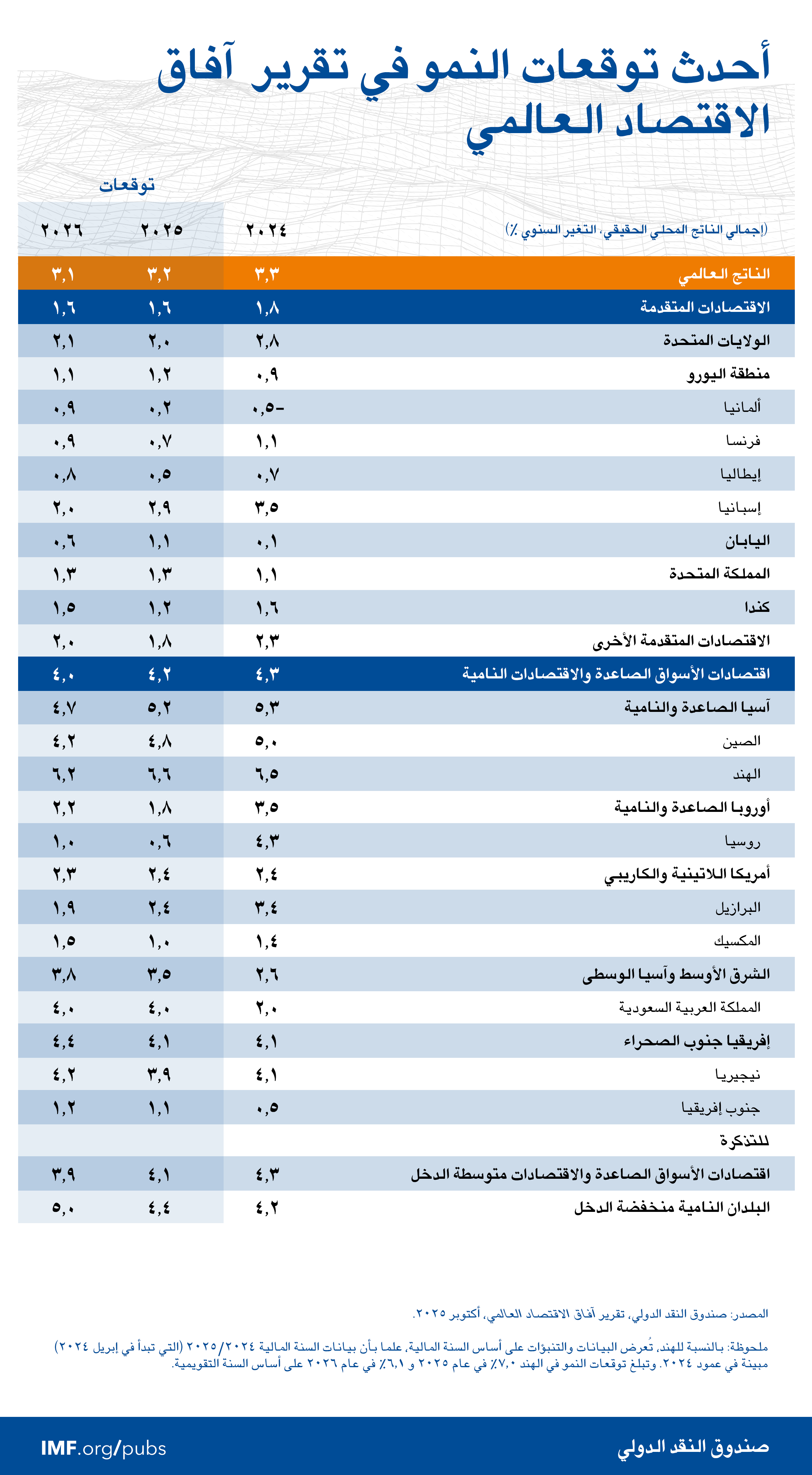 ونتيجة لذلك، ارتفعت توقعات النمو العالمي في أحدث عدد من تقرير آفاق الاقتصاد العالمي مقارنة بعدد إبريل 2025 من التقرير ولكنها لا تزال دون تنبؤات مرحلة ما قبل تحول السياسات. فتشير التوقعات إلى تباطؤ النمو العالمي من 3,3% في عام 2024 إلى 3,2% في عام 2025 و3,1% في عام 2026، مع بلوغ معدل النمو نحو 1,5% في الاقتصادات المتقدمة وأعلى قليلا من 4% في اقتصادات الأسواق الصاعدة والاقتصادات النامية. ويُتوقع استمرار تراجع التضخم عالميا، مع وجود بعض التفاوتات عبر البلدان، حيث يتجاوز المستهدف في الولايات المتحدة – في ظل احتمالات بتجاوز التوقعات – ويواصل انخفاضه في بلدان أخرى.