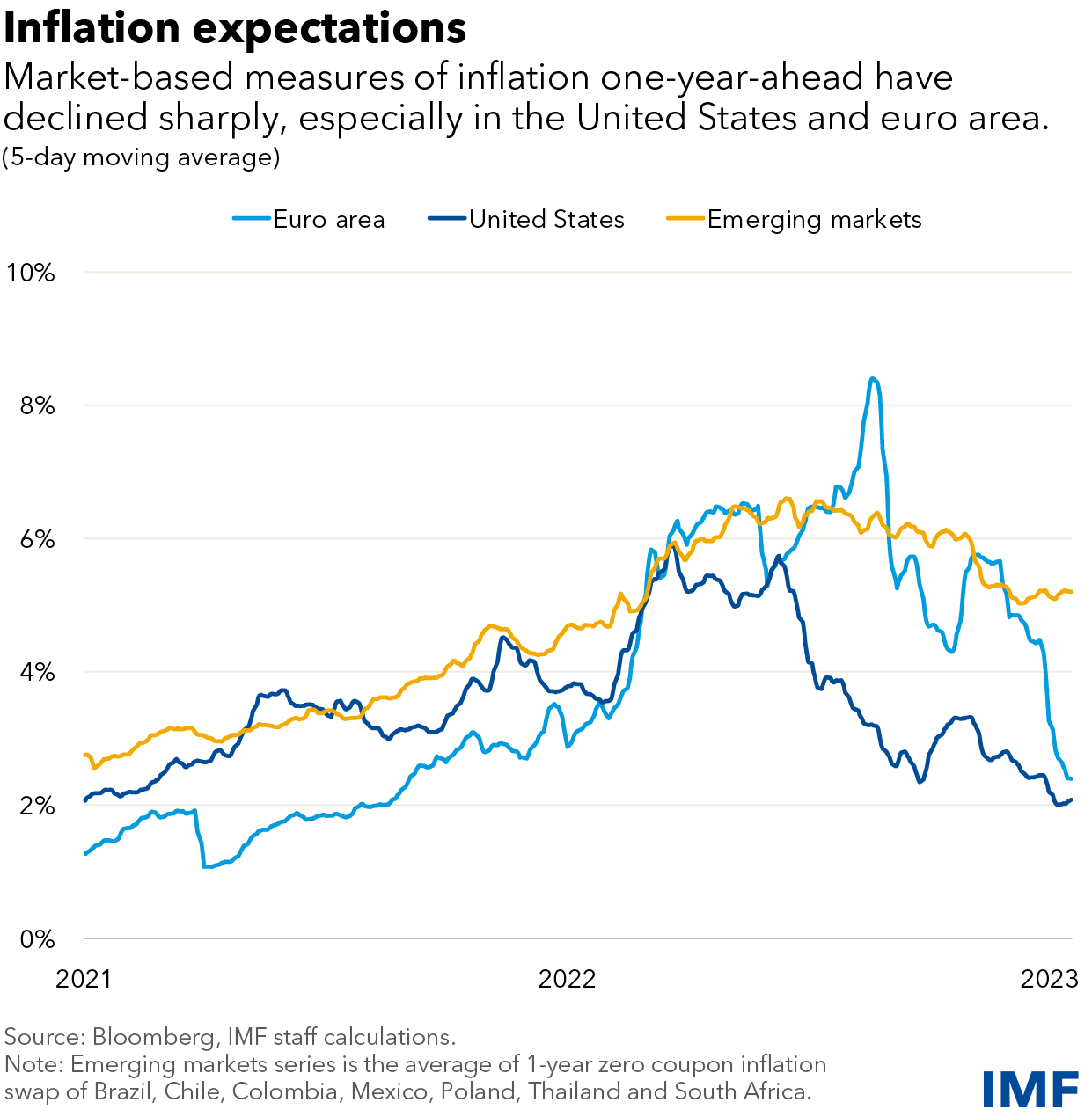 In the United States and the euro area, market-based measures of inflation one year ahead have returned to near the central banks’ 2 percent target from 6 percent last spring. Gauges for several other advanced economies have seen similar drops. In emerging markets, such market-based measures of inflation one year ahead have also been falling, albeit at a slower pace.