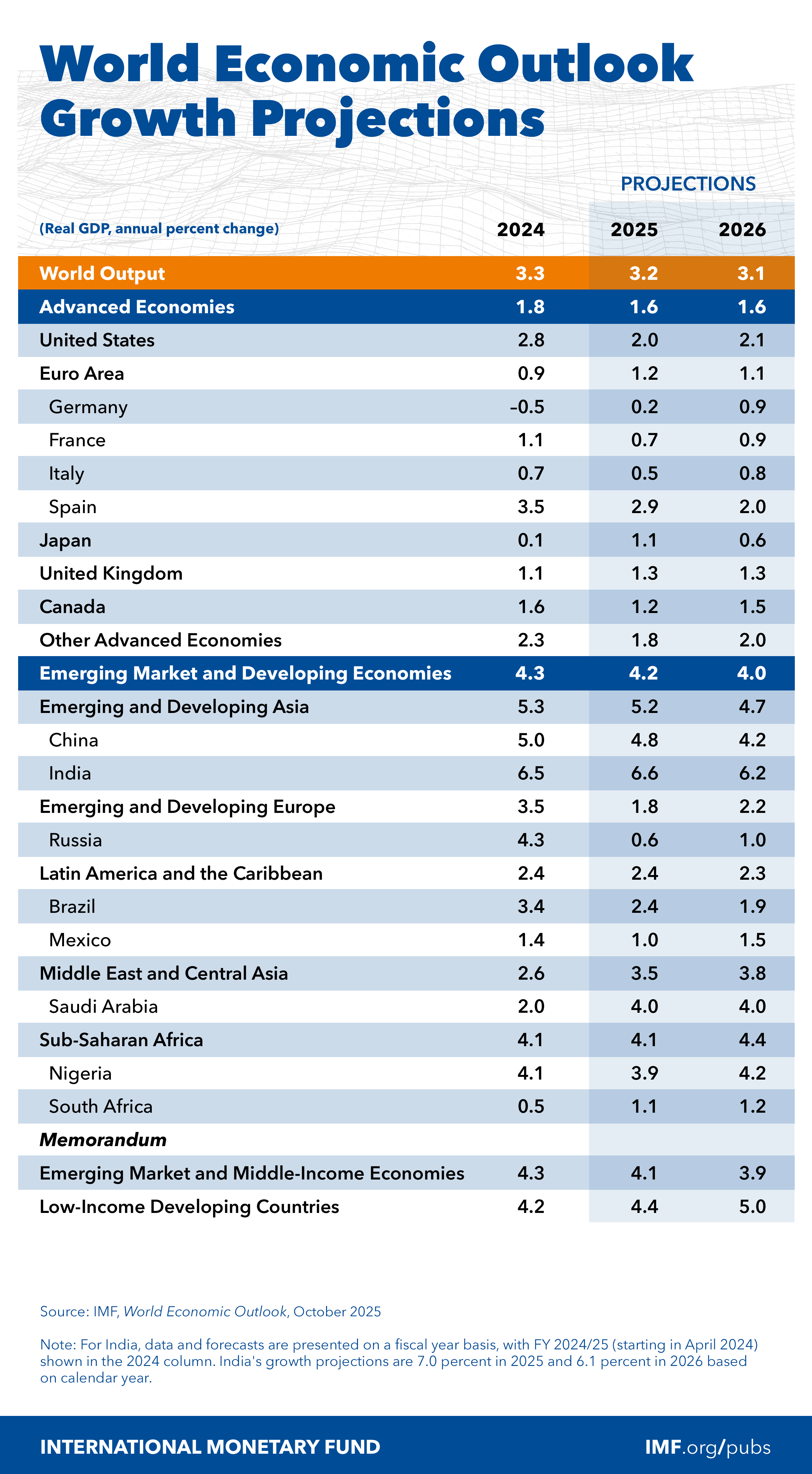 As a result, global growth projections in the latest World Economic Outlook (WEO) are revised upward relative to the April 2025 WEO but continue to mark a downward revision relative to the pre-policy-shift forecasts. Global growth is projected to slow from 3.3 percent in 2024 to 3.2 percent in 2025 and 3.1 percent in 2026, with advanced economies growing around 1.5 percent and emerging market and developing economies just above 4 percent. Inflation is projected to continue to decline globally, though with variation across countries: above target in the United States—with risks tilted to the upside—and subdued elsewhere.