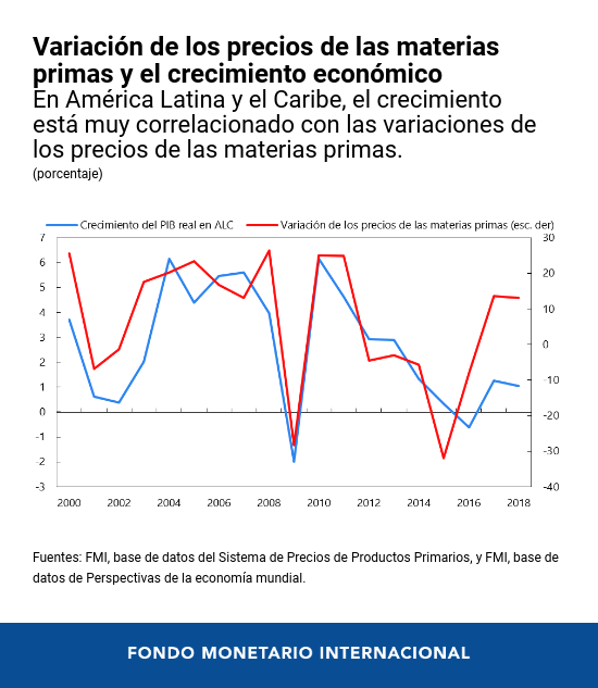 Como las economías de la región dependen mucho de la exportación de materias primas, la actividad económica, los ingresos fiscales y los saldos en cuenta corriente se encuentran expuestos a los choques de precios de las materias primas.