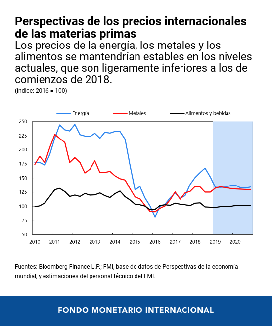 Tras aumentar 55 por ciento entre enero de 2016 y junio de 2018, el índice de precios de productos primarios del FMI disminuyó 9,7 por ciento durante los ocho meses siguientes. Esa caída fue liderada por los precios de la energía, que bajaron 17 por ciento entre junio de 2018 y febrero de 2019, en tanto que los de los alimentos y los metales retrocedieron 4,5 por ciento y 0,6 por ciento, respectivamente.