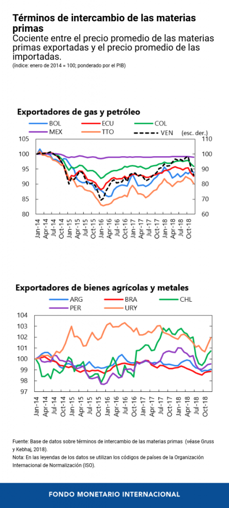 El impacto de los choques de precios de las materias primas varía según el país, de acuerdo con la composición de sus exportaciones e importaciones. Una manera concisa de analizarlo es examinando el índice de los términos de intercambio de las materias primas; o sea, el cociente entre el precio promedio de las materias primas exportadas y el precio promedio de las importadas.