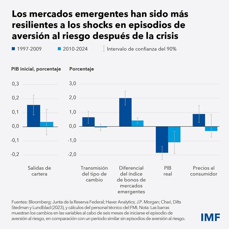 En el pasado, los episodios de aversión al riesgo —en los que los inversionistas mundiales venden los activos de mayor riesgo de forma indiscriminada— con frecuencia se cebaron con los mercados emergentes, desencadenando acusadas salidas de capital y condiciones financieras más restrictivas, lo que a su vez ha provocado desplomes de las monedas y repuntes en la inflación.