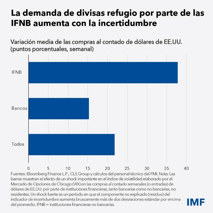 Por ejemplo, las compras de dólares por parte de no residentes en Estados Unidos tienden a aumentar en 24 puntos porcentuales tras una escalada de la incertidumbre financiera —estimada a partir de las fluctuaciones esperadas de las acciones estadounidenses—, como la que se produjo al inicio de la pandemia de COVID-19 en marzo de 2020. Nuestro análisis de datos específicos sobre transacciones entre las principales monedas muestra que ese aumento en la demanda de activos seguros es especialmente pronunciado entre las instituciones financieras no bancarias. Si bien su actividad contribuye a sostener la liquidez en circunstancias normales, puede aumentar la fragilidad del mercado durante episodios de tensión.