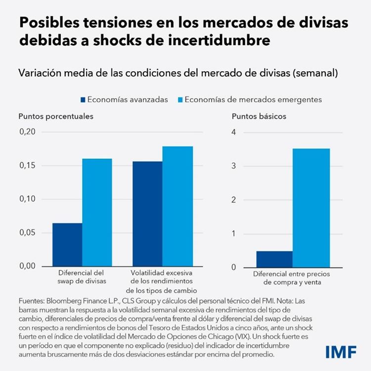 El papel central del mercado de divisas en el sistema monetario y financiero internacional lo hace muy sensible a la evolución macroeconómica y a los cambios en las políticas, en particular a aquellos que aumentan la incertidumbre. Tal como mostramos en un capítulo analítico [link] del Informe sobre la estabilidad financiera mundial (informe GFSR), el aumento de la incertidumbre financiera o económica mundial suele traducirse en una mayor aversión al riesgo por parte de los inversionistas y en un incremento de la demanda de activos refugio, lo que provoca volatilidad y tensiones de liquidez en los mercados de divisas.