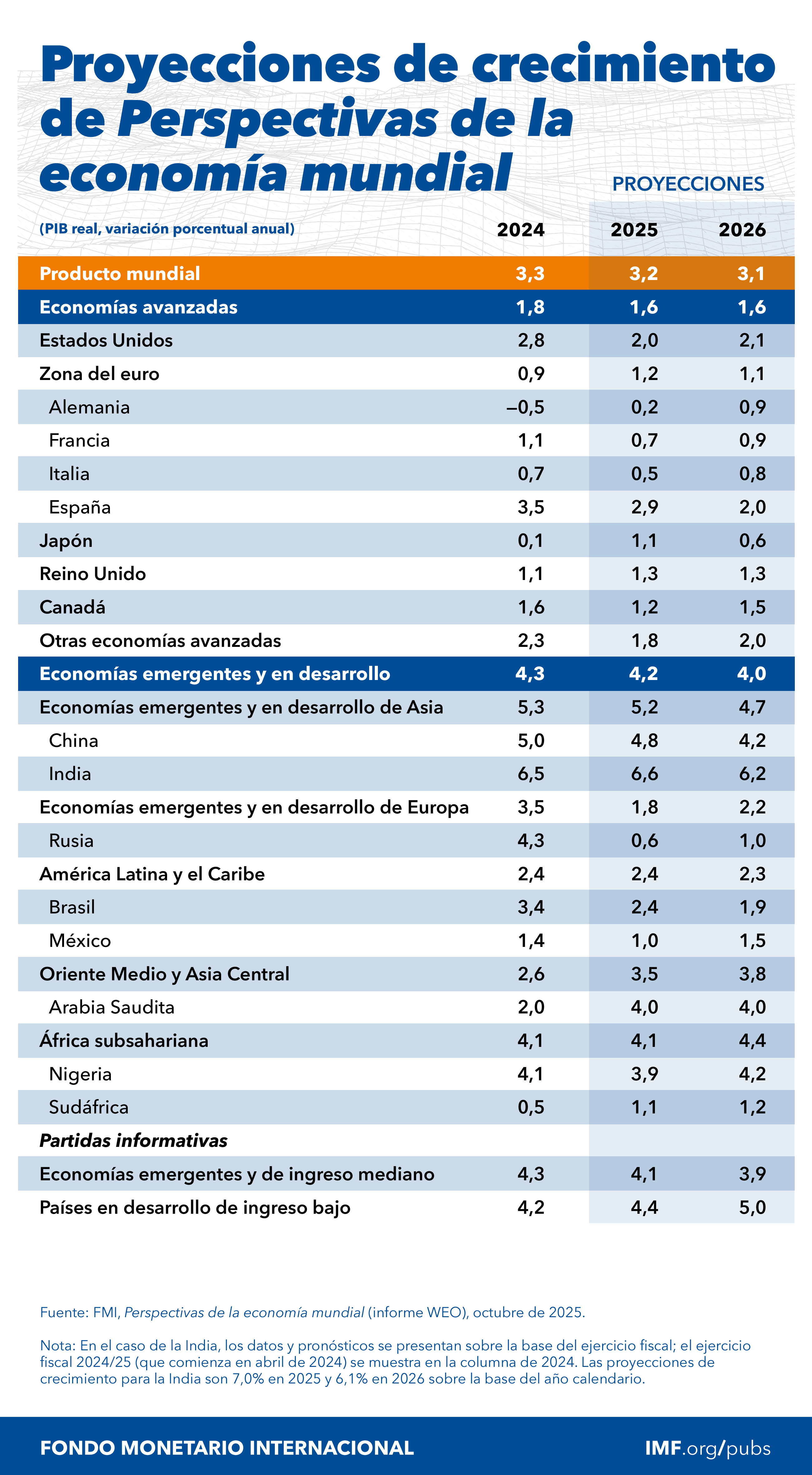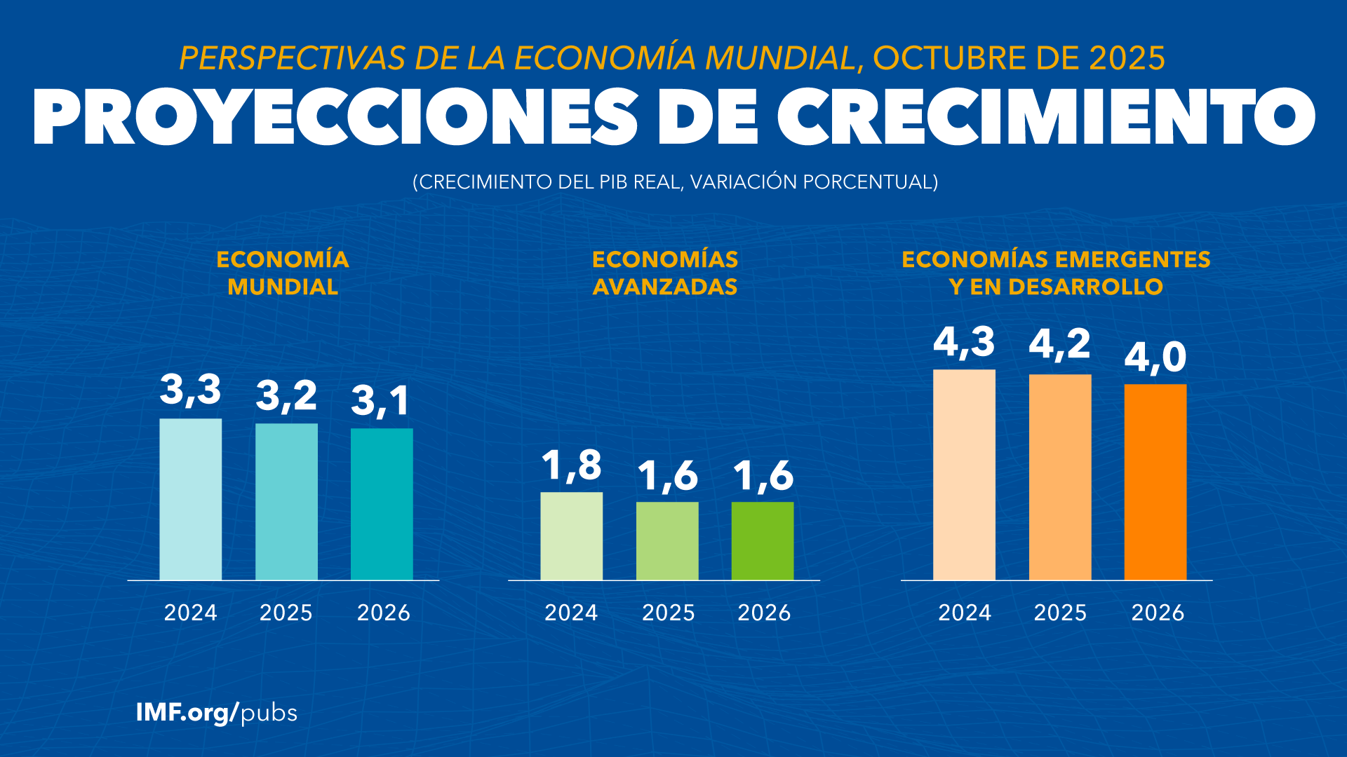 Como resultado, las proyecciones de crecimiento mundial en la última edición de Perspectivas de la economía mundial informe WEO se revisan al alza respecto del informe WEO de abril de 2025, aunque continúan marcando una revisión a la baja respecto de las proyecciones anteriores al cambio en las políticas. Se proyecta que el crecimiento mundial se desacelere del 3,3% en 2024 al 3,2% en 2025 y al 3,1% en 2026, mientras que las economías avanzadas crecerán alrededor del 1,5% y las economías de mercados emergentes y en desarrollo lo harán hasta poco más del 4%. Se prevé que la inflación siga disminuyendo a nivel mundial, aunque con diferencias entre países: por encima de la meta en Estados Unidos, con riesgos de que sea aún mayor, y moderada en el resto.