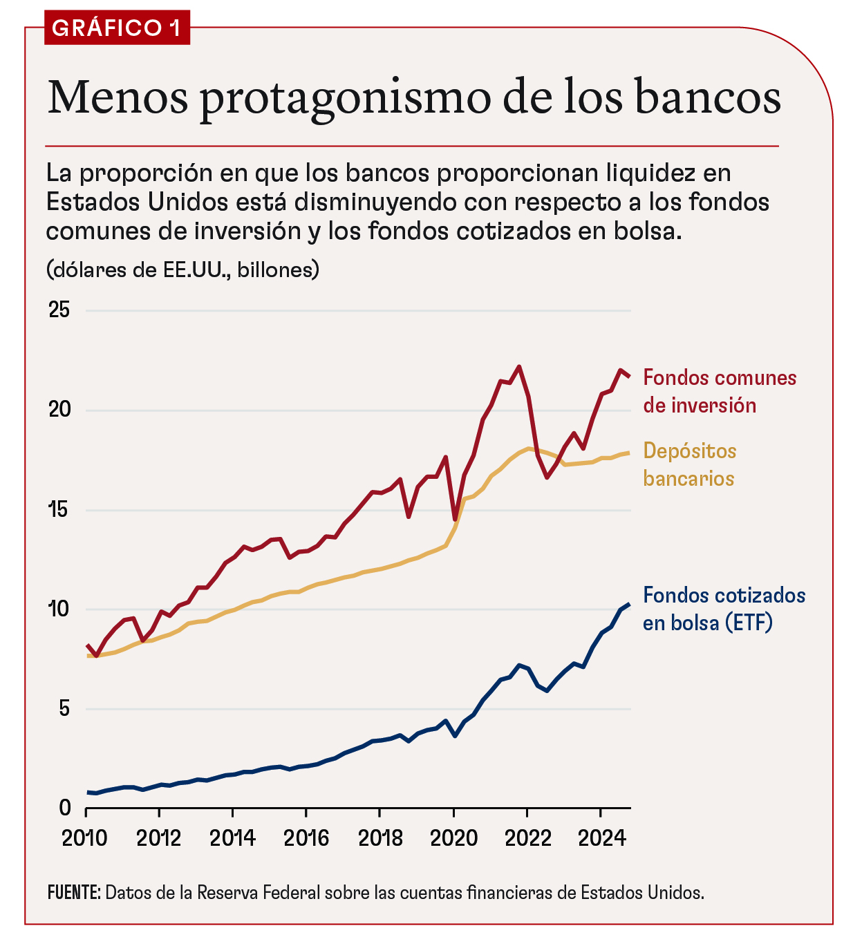 Estos avances redujeron costos, ampliaron el acceso y agilizaron las transacciones. Pero también dieron lugar a importantes cambios en la estructura de la intermediación financiera. La liquidez, el crédito y los pagos —es decir, la esencia del sistema bancario— dieron un giro hacia los gestores de activos, las plataformas tecnológicas y las redes descentralizadas.