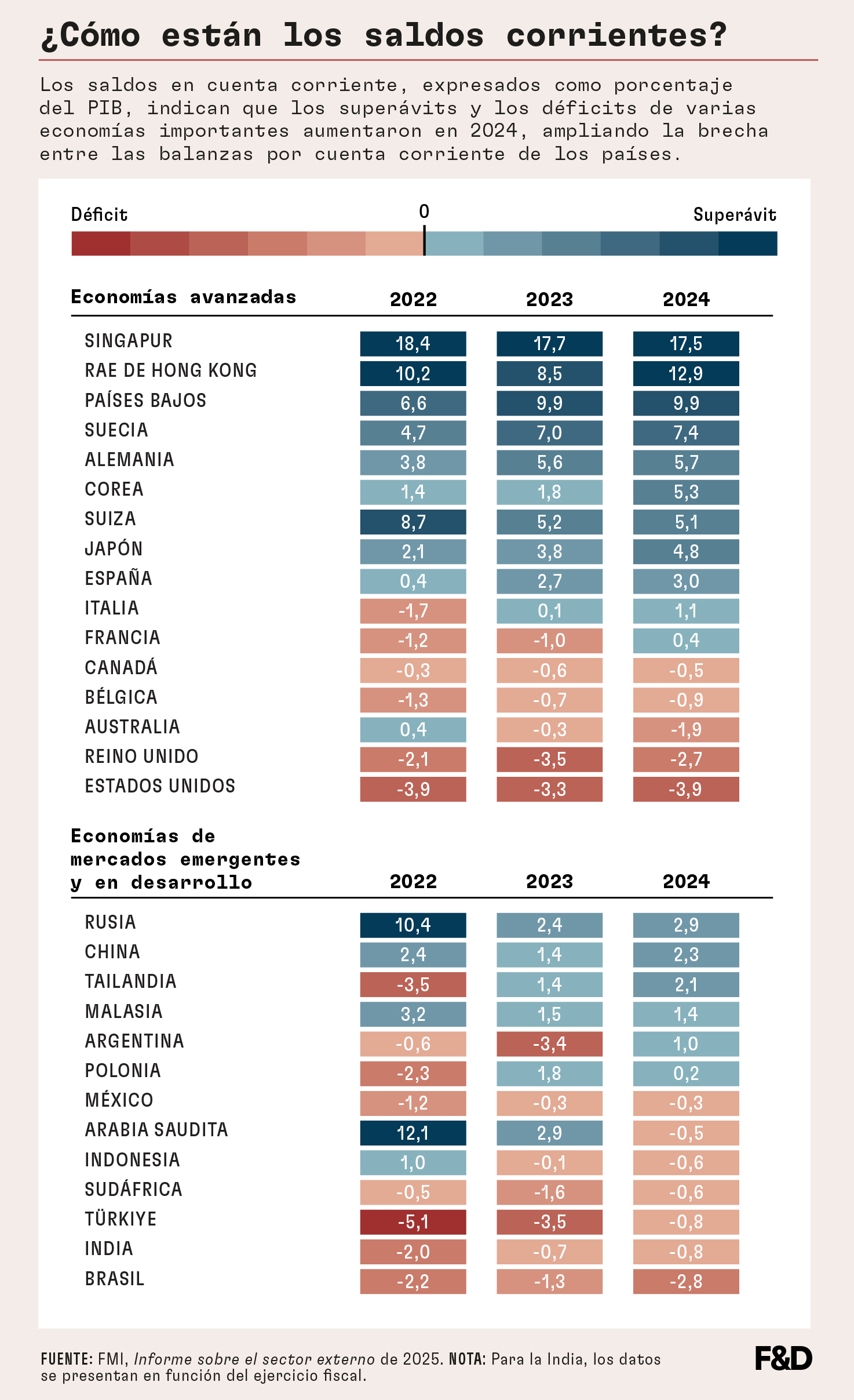 Como se observa en el cuadro, los superávits o déficits de varias de las principales economías han aumentado, lo que ha contribuido a la creciente divergencia entre los saldos de cuenta corriente de los países.