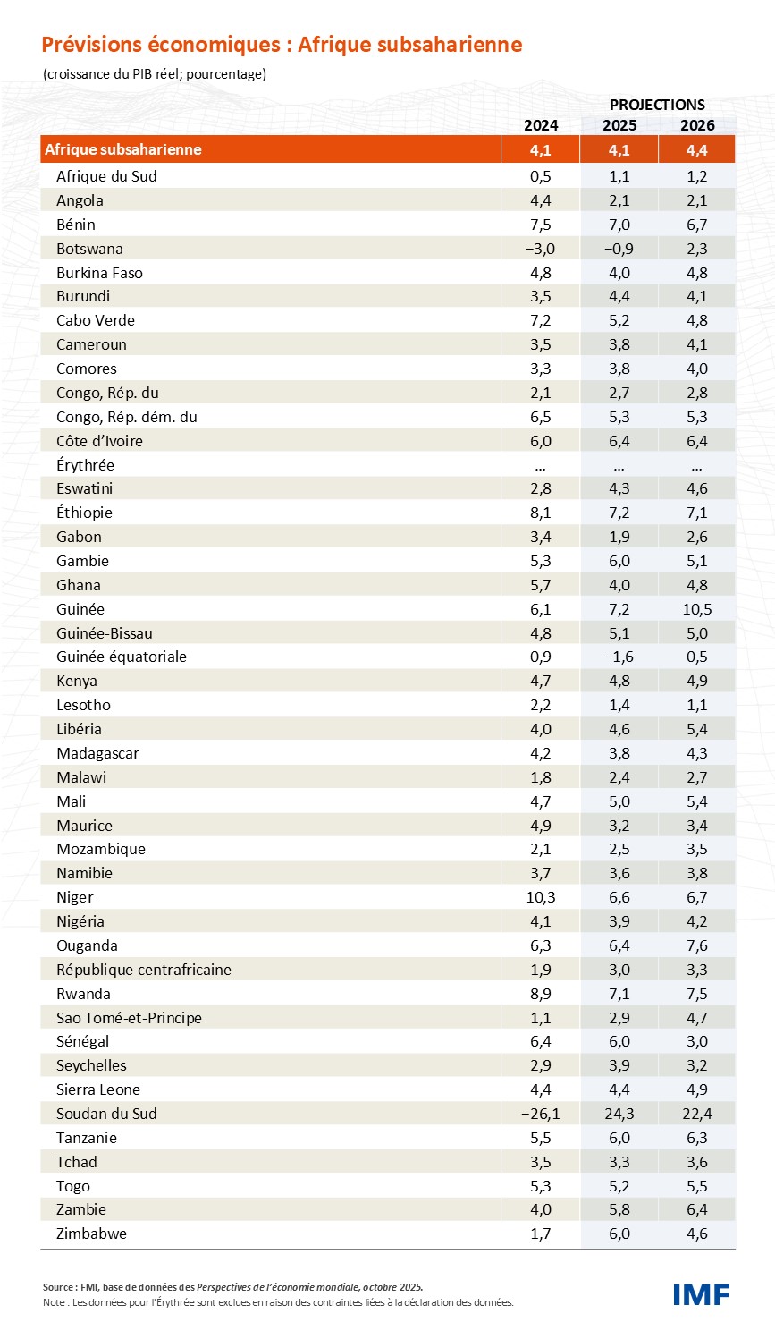 L’économie de l’Afrique subsaharienne fait preuve de résilience malgré un contexte extérieur difficile où les perspectives pour les prix des produits de base sont inégales, les conditions d’emprunt restent contraignantes et le commerce mondial et l’aide internationale se détériorent. La croissance économique devrait s’y maintenir à 4,1 % en 2025, puis enregistrer un léger regain en 2026, à la faveur de la stabilisation macroéconomique et des réformes en cours dans plusieurs des principales puissances économiques de la région. Toutefois, cette résilience ne saurait être tenue pour acquise. La plupart des pays de la région concentrent une multiplicité de facteurs de vulnérabilité, aussi bien sur les plans monétaire, financier, extérieur que budgétaire. L’incertitude perdure, et le solde des risques reste orienté à la baisse. La mobilisation des recettes intérieures et la gestion renforcée de la dette peuvent permettre de renforcer la stabilité macroéconomique tout en finançant les besoins essentiels de développement.