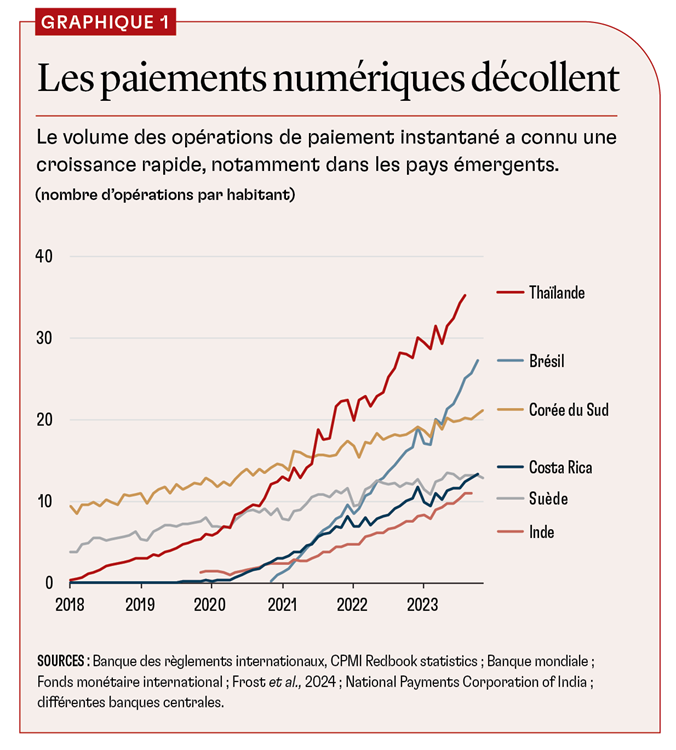 Au cours de la dernière décennie, les modes de paiement ont considérablement évolué avec l’essor des systèmes de paiement dits rapides ou instantanés dans de nombreux pays, en particulier les pays émergents (graphique 1). Ces systèmes permettent d’effectuer des virements en temps réel (ou quasi réel) entre utilisateurs finaux (Frost et al., 2024). Les fintech, les bigtech et les banques existantes assurent des paiements rapides 24 heures sur 24 et 7 jours sur 7. Ces opérations utilisent des applications pour smartphones et des codes QR (quick response) qui fonctionnent même sur des téléphones moins sophistiqués. Elles ont dans l’ensemble permis aux nouveaux acteurs de fournir des services qui concurrencent directement ceux des opérateurs historiques.