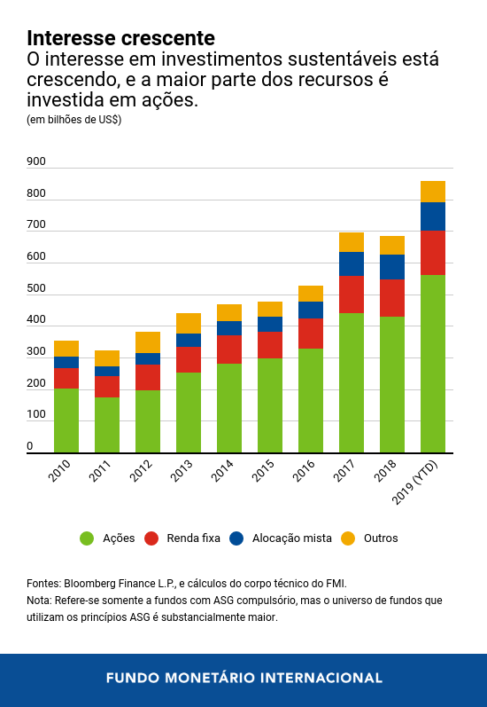 Alguns elementos dos princípios ASG (especificamente aqueles relacionados à governança corporativa) já são há muito incorporados às estratégias das carteiras de investimento e, atualmente, os ativos geridos em fundos relacionados aos ASG variam de US$3 trilhões a US$31 trilhões, dependendo da definição. A aplicação dos princípios de sustentabilidade começou nos mercados de ações, por meio do ativismo de investidores na tentativa de influenciar as decisões das empresas, antes de se estender aos mercados de títulos de renda fixa, principalmente com os títulos que financiam projetos ambientais, os chamados títulos verdes.
