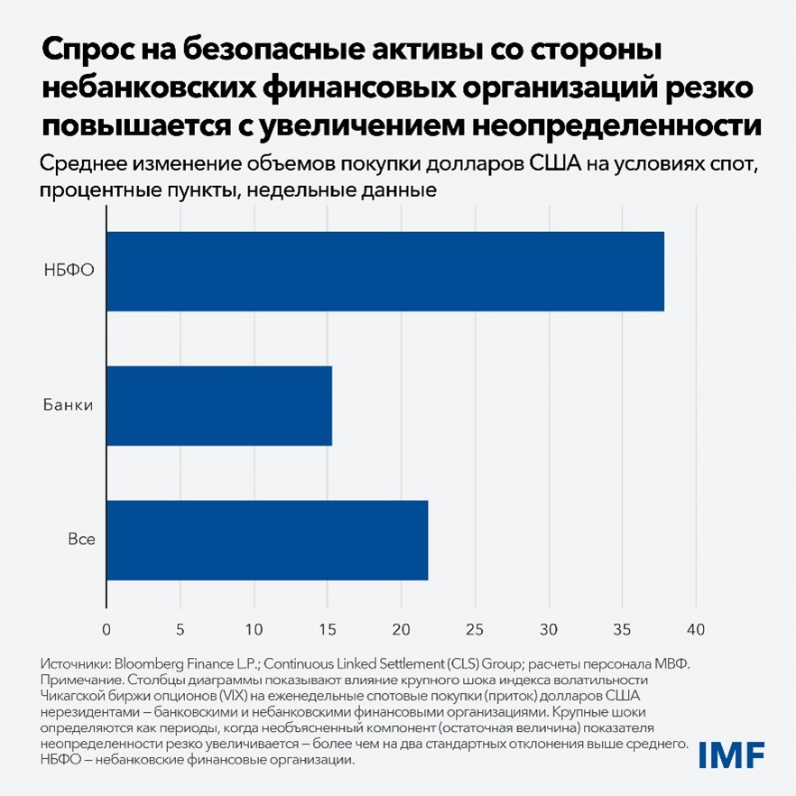 Например, после резкого всплеска финансовой неопределенности (представляемой показателем ожидаемых колебаний цен на фондовом рынке США), такого как отмечался в начале пандемии в марте 2020 года, покупки долларов США нерезидентами, как правило, увеличиваются на 24 процентных пункта. Проведенный нами анализ уникальных данных по операциям с основными валютами показывает, что такой всплеск спроса на безопасные активы особенно выражен среди НБФО. Их деятельность поддерживает ликвидность в нормальных условиях, но может усиливать уязвимость рынка в периоды стресса.