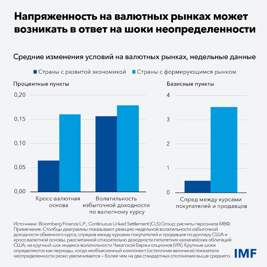 Эти эффекты существенно сильнее в странах с более значительными факторами макрофинансовой уязвимости, например при повышенном уровне государственного долга или при наличии у финансовых организаций крупных сумм активов и долговых обязательств в разных валютах.