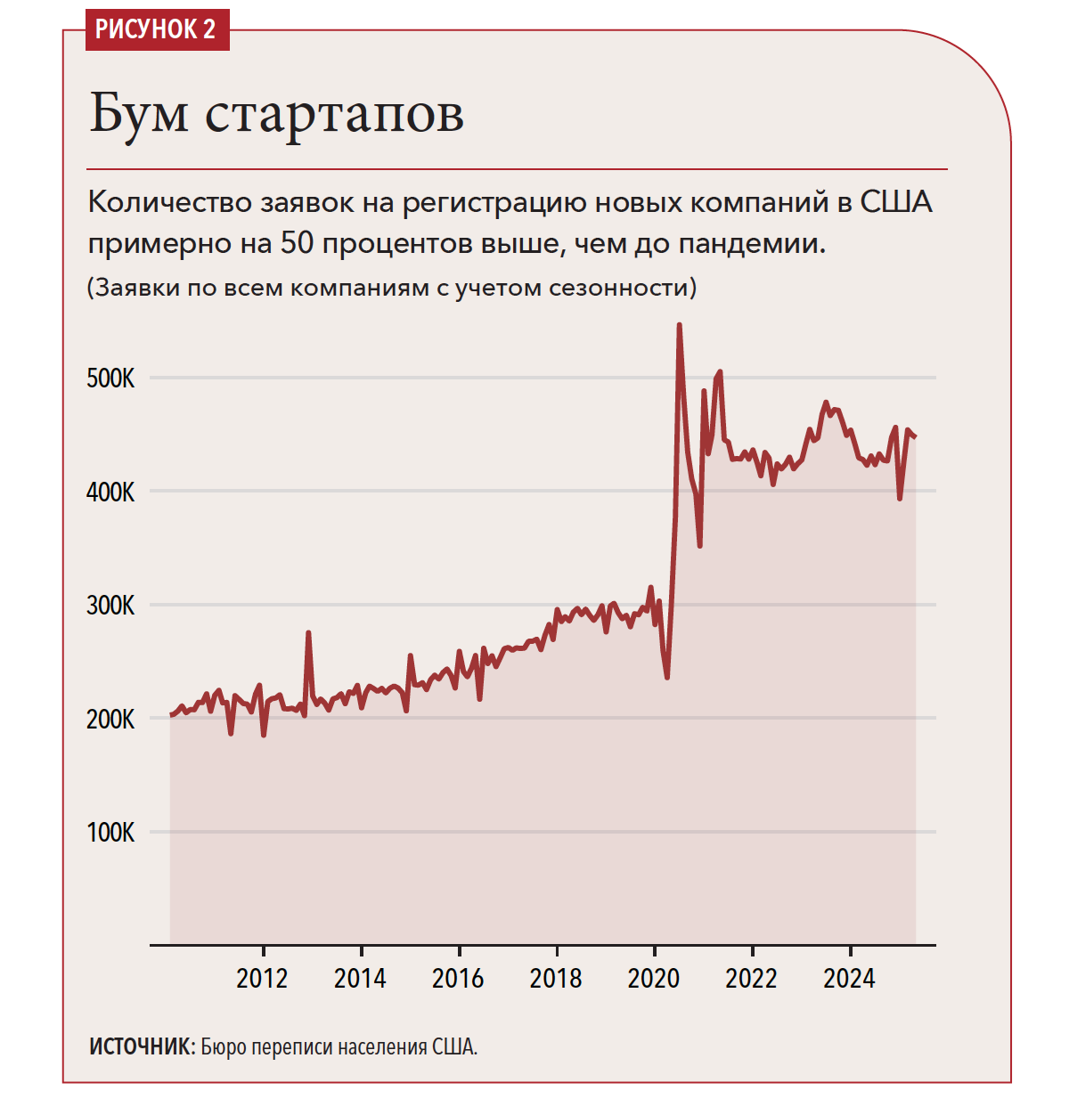 Вопрос в том, оказывает ли вся эта деятельность стартапов существенное влияние на увеличение количества рабочих мест. Недавнее исследование, опубликованное Федеральной резервной системой, указывает на то, что недавний прирост числа стартапов с меньшей вероятностью, чем предыдущие подъемы, будет способствовать росту занятости. По данным ФРС, в 2024 году на долю молодых, быстрорастущих стартапов приходилось менее 6 процентов занятости по сравнению с почти 10 процентами в 1985 году. Стартапы, в основе которых лежат технологии ИИ, как правило, являются капиталоемкими и требуют высокой квалификации персонала, поэтому им требуется меньше работников.