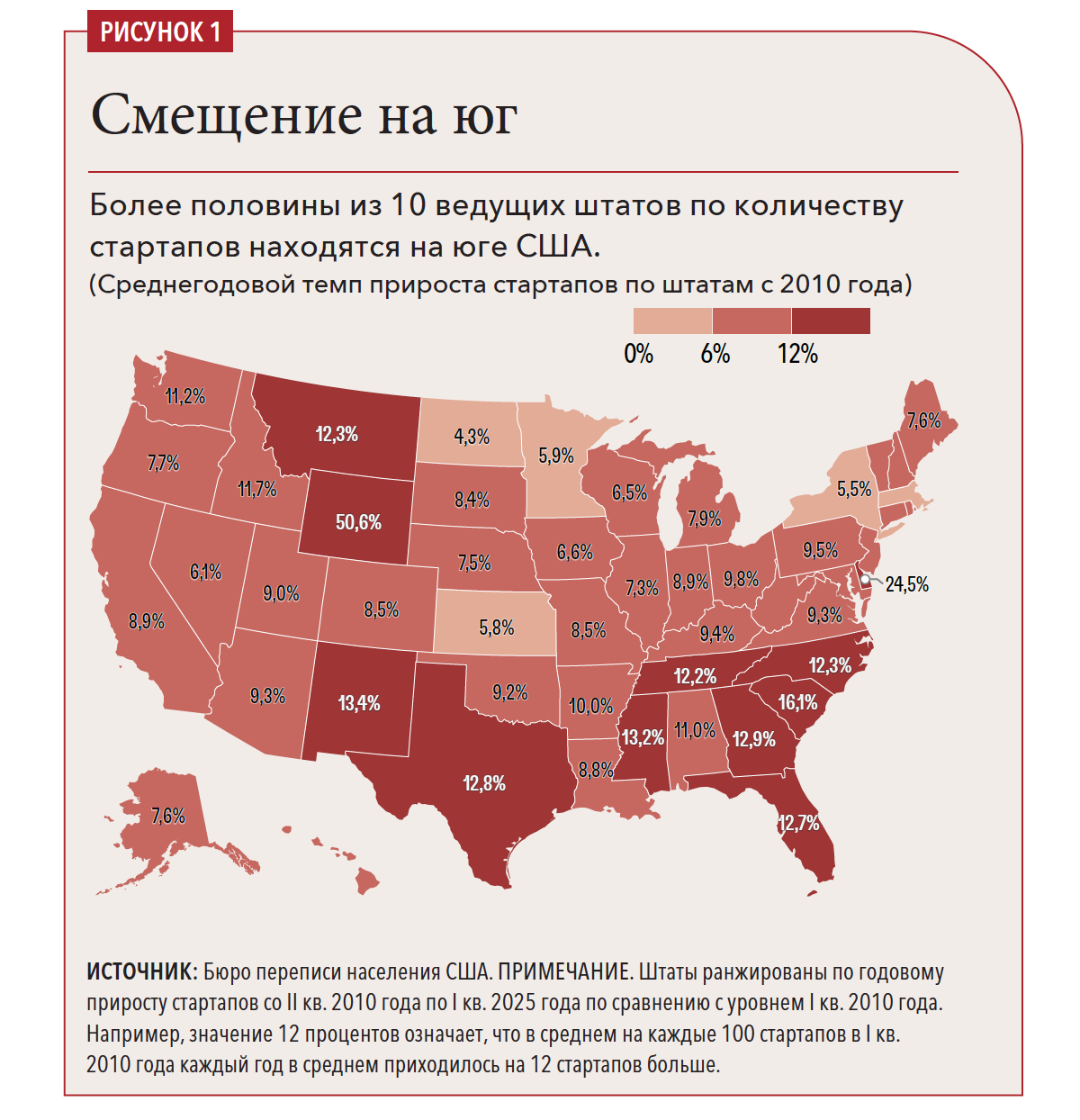 До пандемии значительный уровень предпринимательской деятельности был только в западных штатах. Однако похоже, что это меняется. Данные переписи показывают, что в 2010–2025 годах 7 из 10 штатов с наибольшим количеством стартапов находились на юге, как показано на карте.