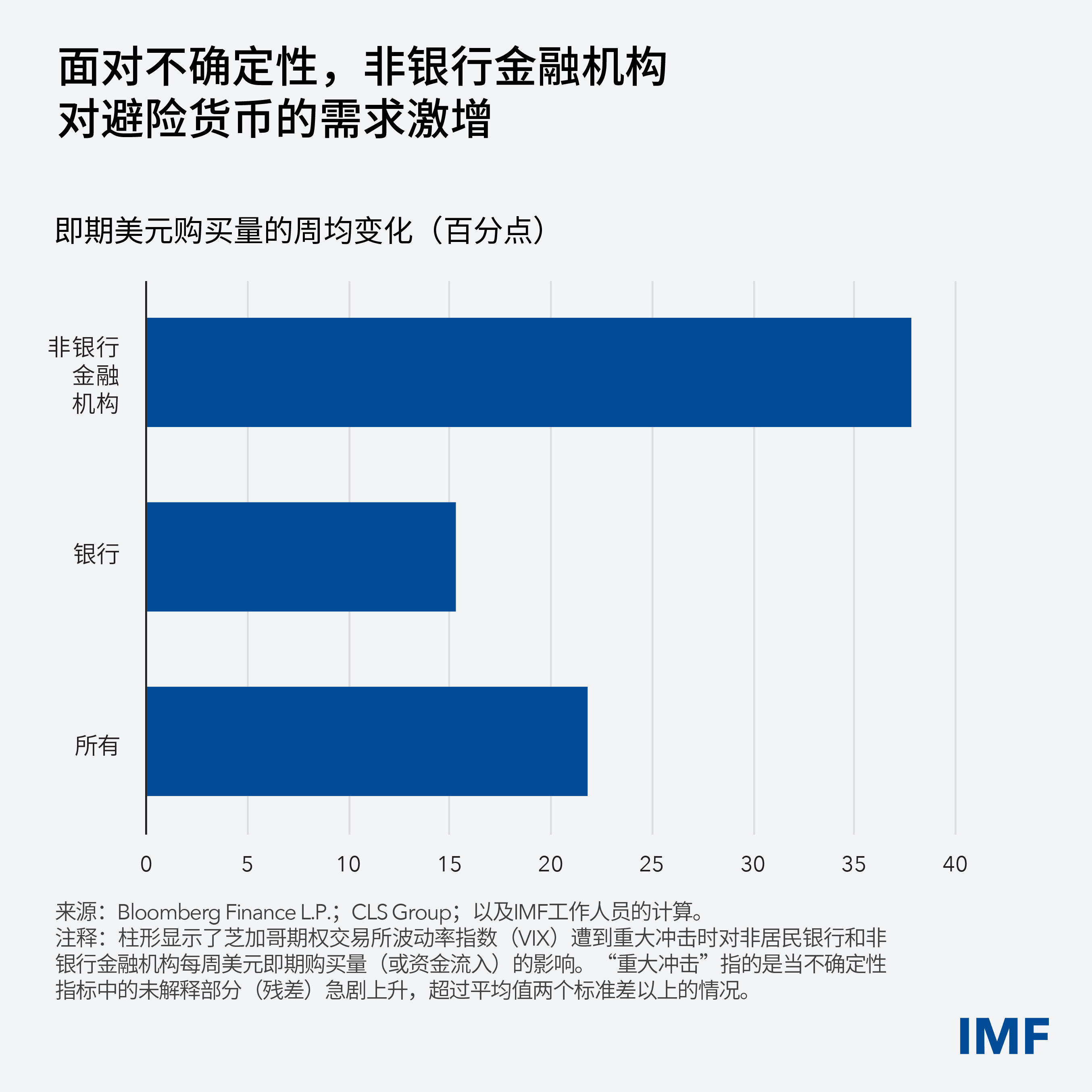 例如,在金融不确定性(以预期美国股市波动率作为代理指标)急剧上升后,非美国居民的美元购买量往往会增加24个百分点,2020年3月新冠疫情暴发期间就出现了类似情况。我们对一套关于主要货币交易的独特数据开展了分析,其显示,非银行金融机构对安全资产的需求激增尤为显著。在正常时期,这类机构的活动有助于支持市场流动性,但在压力事件中,它们却可能增加市场脆弱性。