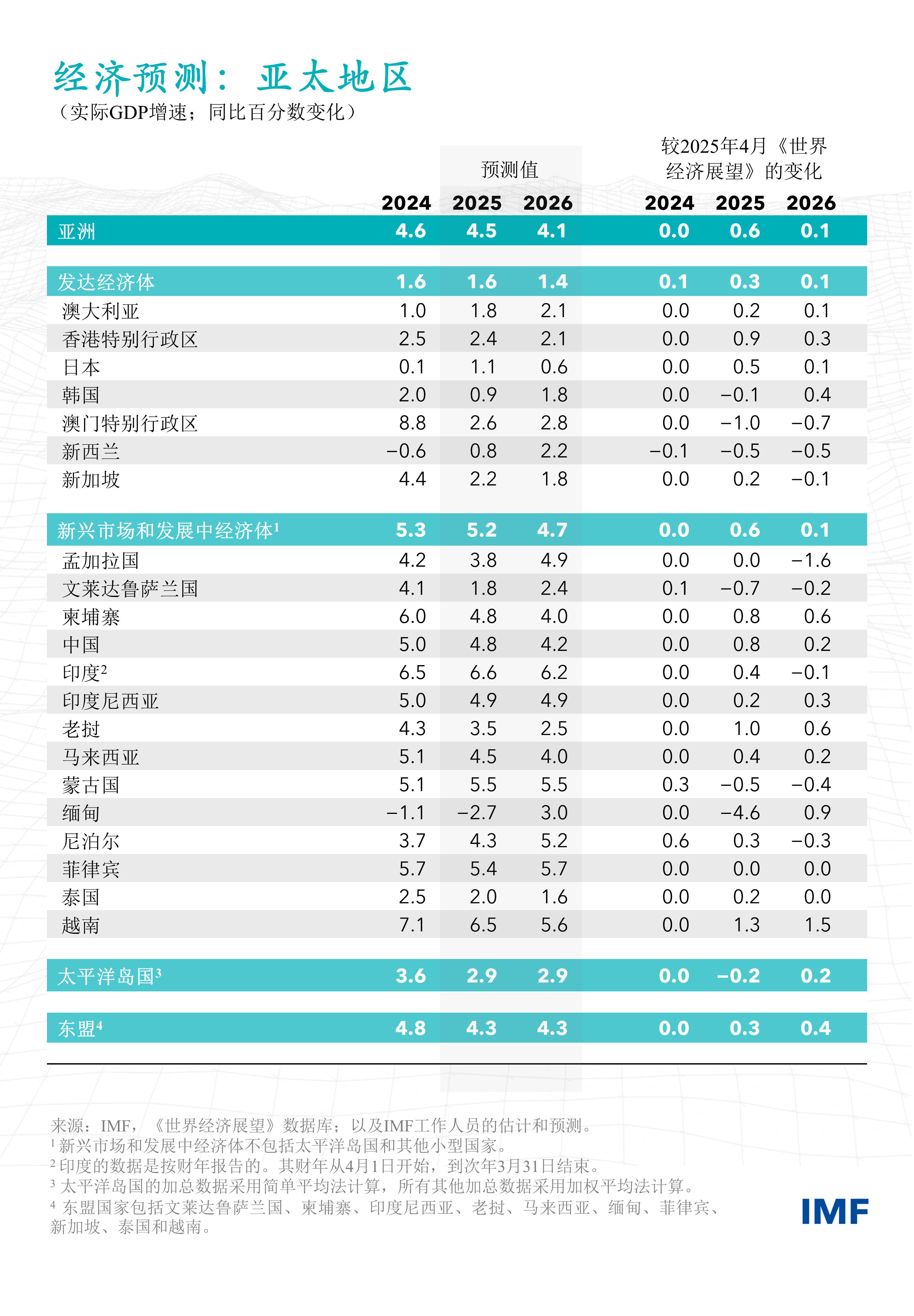 Overview 增速预测 中文 English 日本語 往期内容 2025年10月《亚太地区经济展望》 本次新闻发布会讨论了亚太地区各国的近期经济形势及前景,探讨了影响该地区经济表现的经济政策变化和政策制定者所面临的主要挑战。会上讨论了该地区政策的变化与挑战,提供了具体国家的数据和分析,包括就该地区关注的问题撰写的分析性文章。 博客 增长率预测 出版物 《世界经济展望》 最新发布 《全球金融稳定报告》 最新发布 财政监测报告 最新发布 2024年4月 亚太地区经济展望 2025年6月 金融与发展:欧洲:如何才能化逆境为顺境 2025年9月 2025年年报:在一个充满不确定性的时代实现经济增长